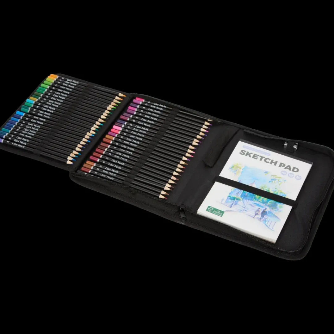 - Bevat een schetsblok, 65 kleurpotloden, 5 schetspotloden, een gum en een puntenslijper