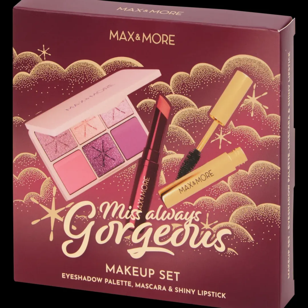 - Met oogschaduwpalette, mascara en lipstick